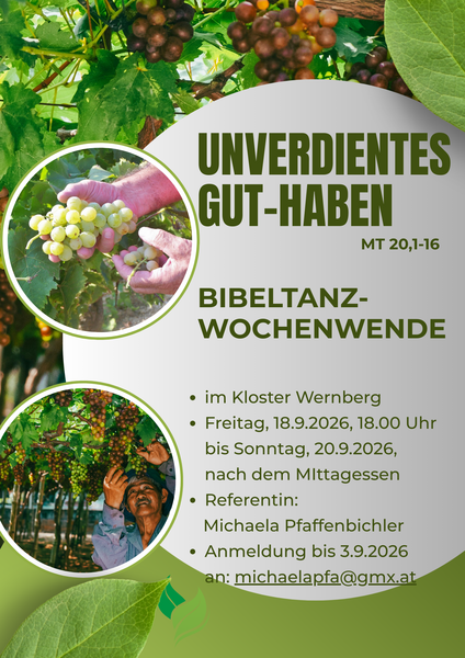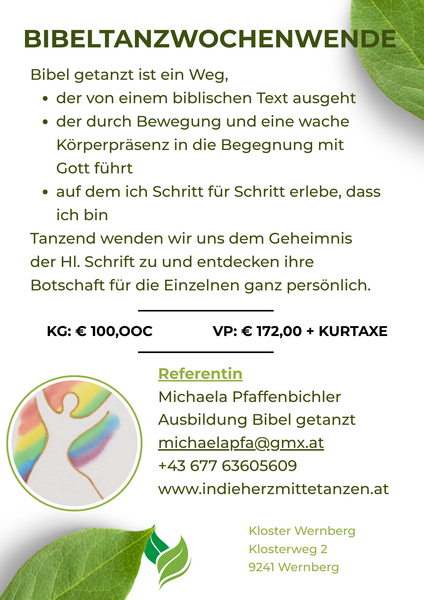 Vom 18. bis 20. September 2026 findet im Kloster Wernberg ein Bibeltanz-Wochenwende statt.